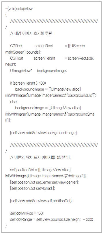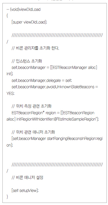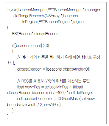 리스트3은 실제적인 위치를 표시해 주는 루틴(특정한 작업을 실행하기 위한 일련의 명령)을 나타낸 것이다. 위치표시에 있어서 가장 중요한 부분은 비콘에서 전달된 수신 신호 감도(RSSI)를 이용해 비콘과 아이폰과의 상대 거리를 계산하는 것이다.