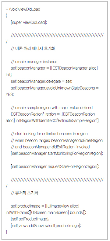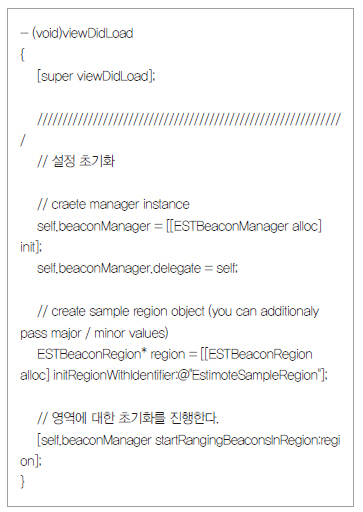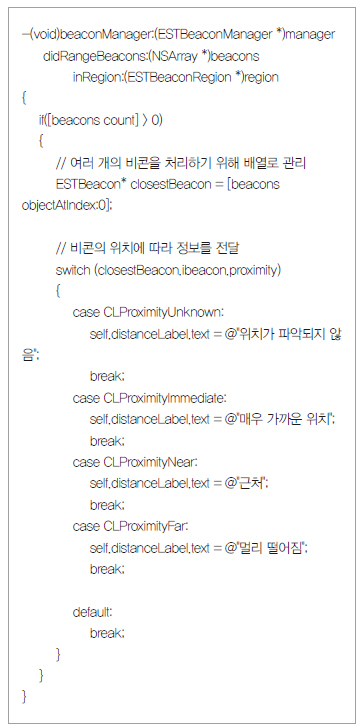 리스트 4는 프락시미티(Proximity) 설정 소스를 처리하는 루틴이다. 프락시미티는 비콘과 아이폰과의 실제 위치를 구하는 것이 아니라 근처에 접근했을 때 필요한 정보를 표시해 주는 기능을 한다. 아이비콘 설명처럼, 아이폰이 물건 근처에 왔을 때 제품에 대한 정보를 표시해준다. 앞에서 거리를 구하는 기능이 실제 거리와는 오차가 심하기 때문에 실질적으로는 프락시미티 기능을 사용하는 것이 더 유용할 것이라고 생각한다.