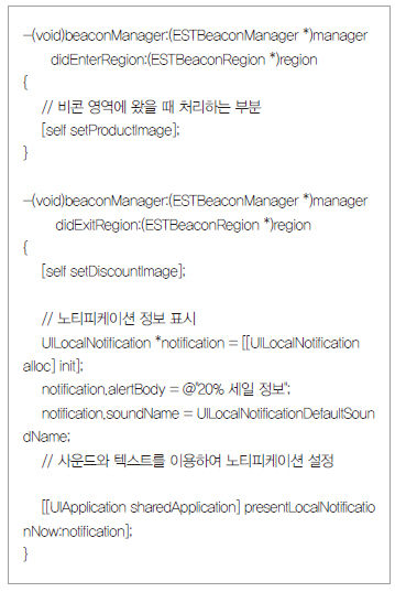 리스트6은 노티피케이션 초기화 소스를 나타낸다. 노티피케이션 기능은 아이폰을 가지고 상점 근처에 갔을 때 통보를 해줌으로써, 사용자의 별도 동작 없이도 상품·이벤트 정보를 전달할 수 있기 때문에 유용하다. 그림 10은 노티피케이션을 통해 아이폰에 전달된 정보를 보여준다.