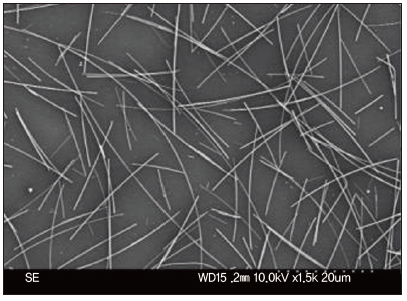 그 중에서 플렉시블 디스플레이용 터치센서 전극재료로 가능성이 높을 것으로 예상되는 것은 AgNW와 금속 메쉬이다. 그 이유는 AgNW의 경우, 귀금속 특유의 우수한 전기전도도를 갖추면서 형상은 한 방향으로 길고 종횡비를 가지고 있어 벤딩 특성이 우수하기 때문이다. 그림 7은 PET 필름위에 AgNW 코팅된 것이다.