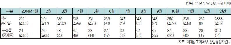 디스플레이 패널 업체들은 지난해 중국 등 경쟁국들의 거센 추격 속에서 분투했지만, LCD TV 패널 가격의 보합세와 홍콩을 포함한 대 중국 및 아세안 수출 감소로 인해 수출액이 전년 대비 3.2% 감소한 283억 8천만 달러를 기록했다.