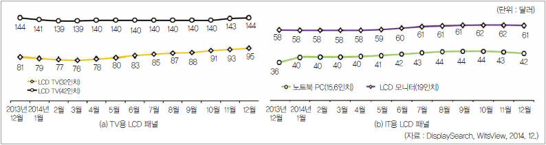 TV 패널 가격은 계절적인 수요 증가로 인해 대화면 및 중소형 TV용 패널 가격이 상승세를 유지하고 있으며, 모니터 등의 IT 패널 가격은 윈도 XP 지원 종료로 기업용 PC 수요가 지속돼 양호한 가격 흐름이 지속될 것으로 전망된다.