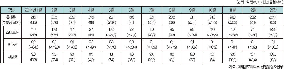 우리나라 휴대폰 시장은 작년 한 해 선진 시장의 성장세가 둔화되고 샤오미 등과 같은 후발 업체의 공세가 거세졌음에도 불구하고 264억 4천만 달러(2013년 대비 6.3% 증가)의 수출을 기록하며 2년 연속 성장세를 나타냈다.