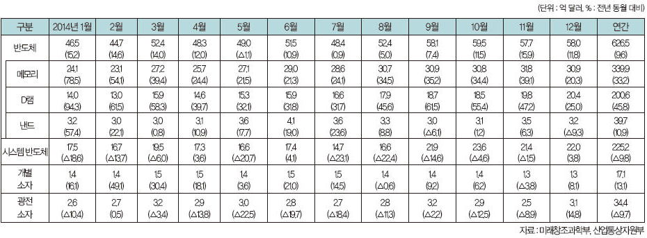 반도체 분야의 경우 2011년 501억 달러, 2012년 504억 달러, 2013년 571억 달러로 수출 상승세가 이어져 왔으며, 작년에는 국내 업체의 미세 공정, 3D 낸드 등의 기술 우위를 바탕으로 모바일 시장의 주도권을 확보, 626억 달러를 달성하며 효자 노릇을 톡톡히 했다. 메모리 반도체의 경우, 모바일 메모리 반도체의 수요와 미세 공정 기술 우위를 바탕으로 전년 대비 33.2% 증가한 339억 9천만 달러를 기록하며 사상 최대 실적을 기록했다. 그러나 시스템 반도체의 경우에는 전년 대비 9.8% 하락한 225억 2천만 달러에 머물렀는데, 이것은 모바일 AP(Application Processor) 등의 수출 부진이 영향을 끼쳤기 때문이라고 생각된다.