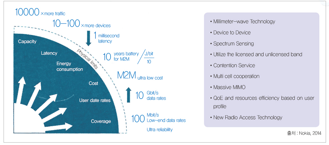접속 기기 수나 저전력 통신은 IoT를 감안한 요구사항이라고도 볼 수 있다. IoT의 경우 사용되는 센서, 칩들이 엄청나게 많고 이들이 동시에 접속되어야 하며 배터리 용량 문제로 저전력이어야 한다. 뿐만 아니라 차세대 미디어나 동영상 서비스들은 지연시간이 매우 중요하므로, 1ms의 지연시간도 기술적으로 요구되고 있다.