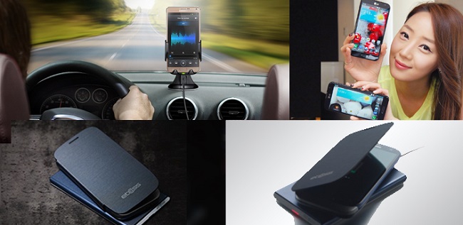 ▲ 사진은 왼쪽 위부터 시계방향으로 삼성전자의 무선 충전 거치대, LG 옵티머스 G pro, 한림포스텍의 이투스 무선충전기이다.