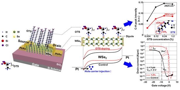 그러나 불순물의 농도를 미세하게 조절하는 과정에서 한계가 있어 연구팀은 종이처럼 매우 얇은 2차원 나노반도체의 결정성을 해치지 않고 농도를 조절할 수 있는 자기조립 단분자막으로 간단하게 기존 기술 대비 10배 낮은 농도의 p형 도핑기술을 개발했다. 연구팀은 양전하를 띠는 자기조립 단분자막(OTS)을 선택해 증착한 후 아래에 놓인 반도체의 전자를 끌어당겨 전자의 농도를 조절하는 원리를 이용해 ㎠ 면적당 천억개(10의 11승) 이하로 정공 농도를 조절했다.