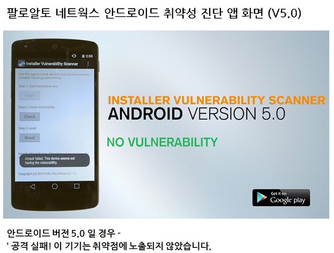 글로벌 네트워크 보안 분야 선도 기업인 팔로알토 네트웍스는 최근 구글의 안드로이드 OS의 보안 취약점을 공개했다. 이 보안 취약점은 사용자들이 구글의 안드로이드 OS 4.3 이하의 버전을 탑재한 모바일 기기들을 가지고 구글 공식 앱스토어인 구글 플레이가 아닌 사설 앱스토어를 통해 앱을 설치할 때 해커들이 허가하지 않는 정보를 탈취하거나, 모바일 기기의 전체 서비스에 접근 및 개인 정보 탈취, 멀웨어 설치 등에 악용될 수 있다는 것이다.