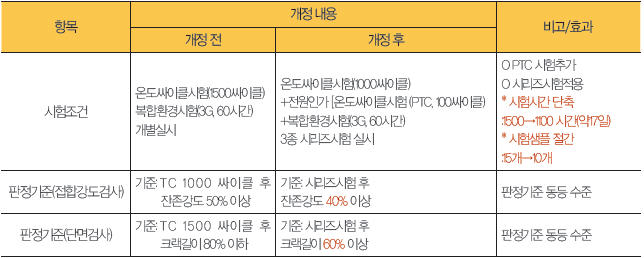 전장품 회로의 전기적 특성 변화에 기인한 기능 불량 검출력을 향상하기 위해 전원 인가 온도 싸이클 시험(Power Temperature Cycle)을 추가했으며, TC·PTC·복합 환경 시리즈 시험을 적용해 필드 작동 환경을 반영하고 시험 시간을 단축한다.