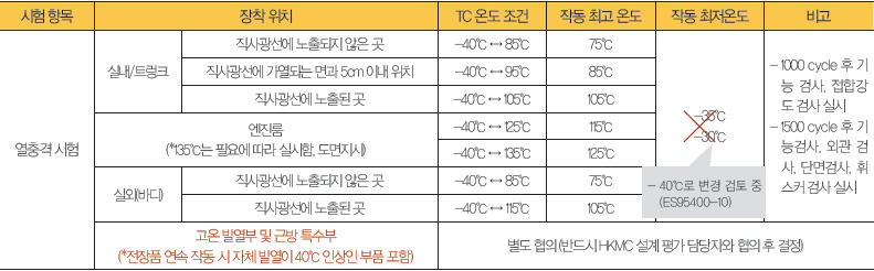 ▲ 표 3. 장착 위치별 열충격 내구 시험 조건