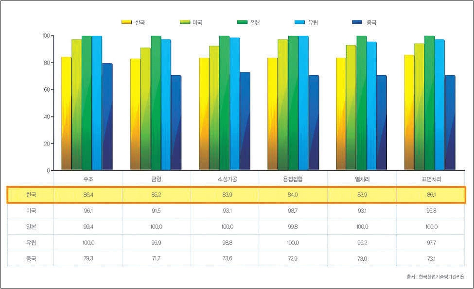▲ 그림 3. 뿌리산업 세부 분야 국가별 기술 수준
