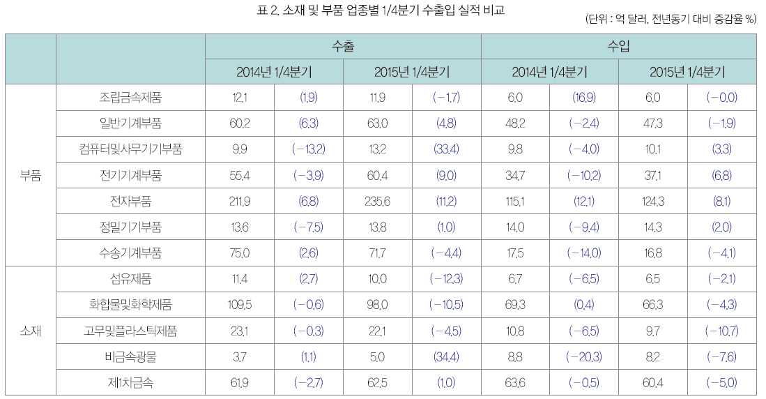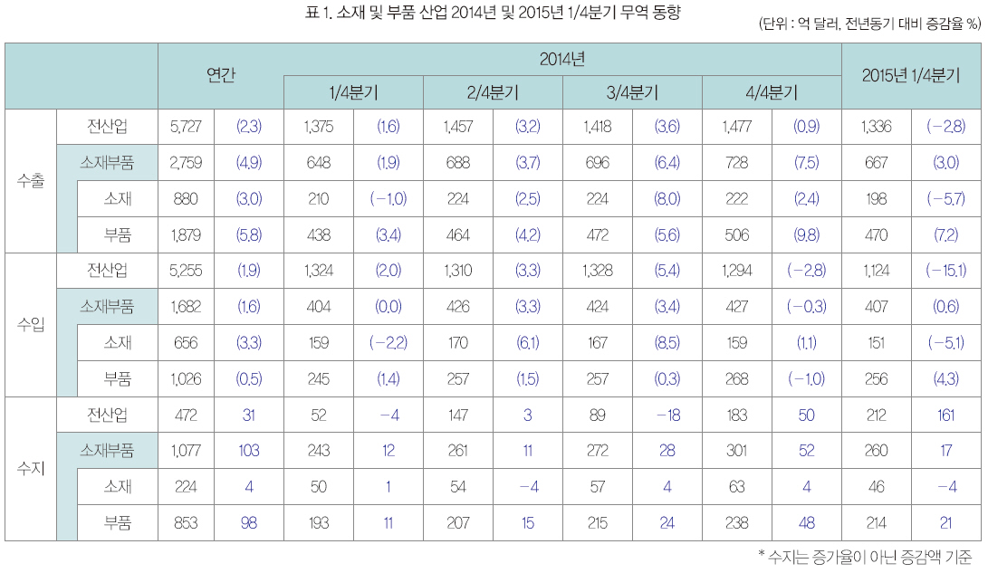전자부품, 컴퓨터 및 사무기기 부품, 전기기계 부품이 무역 흑자를 연이어 갱신하며 우리나라 무역수지 효자 노릇을 톡톡히 하고 있다. 그러나 유가 하락에 민감하게 영향을 받는 석유화학제품의 단가가 하락하면서 수출입 감소 요인이 발생함에 따라 소재 분야의 수출입 증가율이 감소세로 돌아서고 있다.