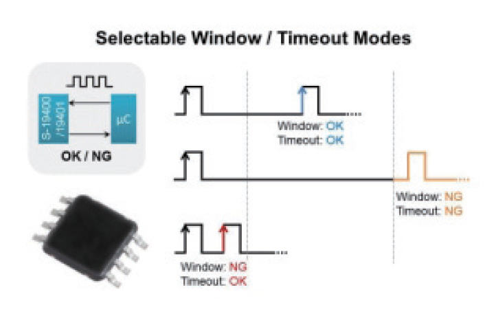 S-19400는 창 또는 타임아웃 모드를 선택해 작동할 수 있어 설계상의 유연성을 강화한다. 타임아웃 모드에서 마이크로 컨트롤러 공급 에너지가 저하되거나 중지되었을 때 타이머는 컨디션 이상을 호출한다. 창 모드에서는 마이크로 컨트롤러 공급 에너지가 저하되거나 너무 항진될 경우 컨디션 이상을 호출해 전반적인 신뢰도와 안전성을 개선한다.
