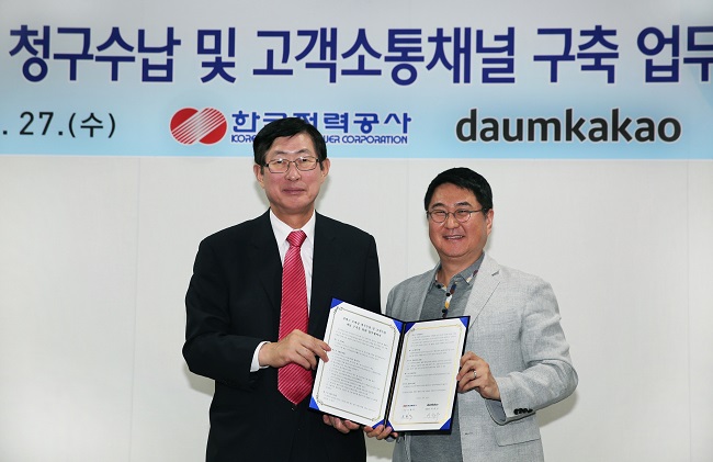 한국전력(사장 조환익)은 어제(27일) 한전 본사에서 다음카카오(대표이사 이석우)와 핀테크를 적용한 전기요금 청구 및 납부 그리고 양방향 소통 채널 구축에 상호 협력하는 업 무협약을 체결했다.