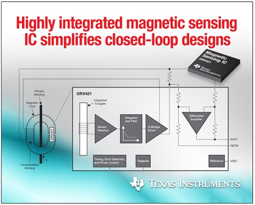 TI는 새로운 자기 감지 집적회로(DRV421)를 출시한다고 밝혔다. DRV421은 필요한 모든 신호 컨디셔닝 회로와 함께 플럭스게이트(Fluxgate) 센서 및 보상 코일 드라이버를 완전히 통합했다. 그리고 완전 통합으로 우수한 센서 정확도 및 선형성, 높은 신호입력 범위를 제공하며, 기존 폐루프 센서보다 시스템 설계를 더욱 간소화할 수 있다.