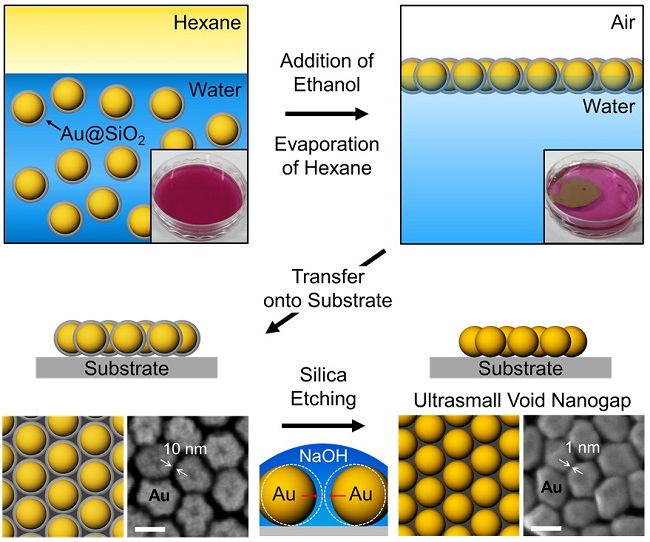 연구팀은 기존 기술들의 문제점을 해결하기 위해 금속 나노 입자에 껍질을 씌우고 입자를 자가 배열한 후 껍질만을 선택적으로 제거하는 손쉬운 방법을 이용하여, 1나노미터 크기의 초미세 간극을 대면적으로 만드는 데 성공한 것이다.
