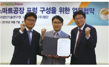 한국형 스마트공장 모델 발굴 위한 싱크탱크가 구축된다. (주)첨단은 한국생산기술연구원 청정생산시스템연구소, 코엑스와 함께 국내 제조업 혁신 및 스마트공장 관련 한국형 모델발굴과 제조산업 적용 사례 공유를 통한 전반적인 산업 수준 향상을 위해 양해각서(MOU)를 지난 9월7일 체결했다.
