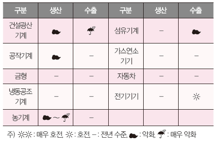 업종별 하반기 기상도는 수출에서는 전기기기, 금형, 냉동공조, 공작기계 등이 ‘호전’ 또는 ‘전년 수준’을 유지할 것으로 전망되며, 생산의 경우도 금형, 냉동공조, 섬유기계 등이 ‘전년 수준’으로 전망된다.