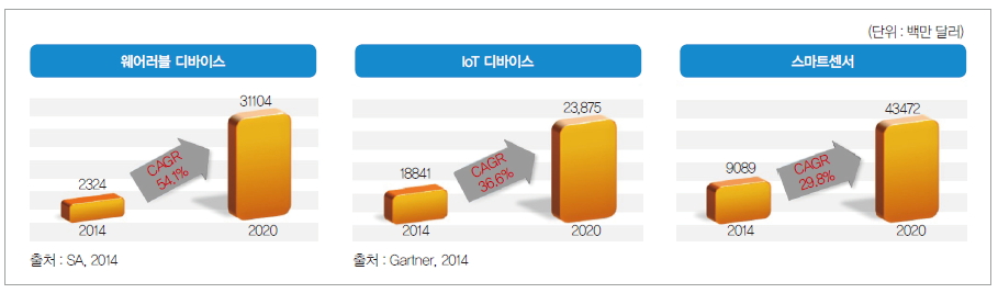 스마트 디바이스 산업은 개인의 창의적인 아이디어가 제품화·창업으로 연결되고 다양한 서비스에 활용될 수 있어 창조경제 실현의 중요한 수단으로 여겨진다. 최근 정보통신기술(이하, ICT) 시장을 주도해온 PC 및 스마트폰과 같은 우리나라 주력 디바이스 산업은 2015년부터 성장이 둔화되고 있으며, 세계적인 기업은 웨어러블 및 IoT 등의 제품과 서비스를 경쟁적으로 출시하면서 세계 초기시장 선점을 위한 주도권 경쟁이 가속화되고 있어, 향후 시장 규모가 급속하게 증가할 것으로 전망된다(그림 1).