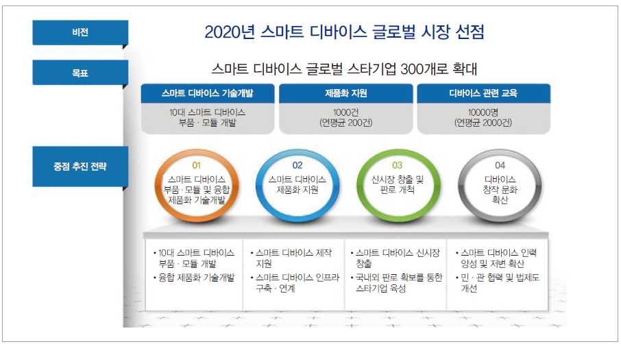 지금까지 국내 ICT 시장을 주도해온 PC, 스마트폰 시장은 성장이 둔화되는 반면, 웨어러블과 IoT로 대표되는 스마트 디바이스 산업의 성장세가 두드러진다. 하지만 한국의 스마트 디바이스 개발을 위한 핵심 기술 경쟁력과 중소 및 벤처기업의 디바이스 개발 인프라와 투자 환경은 턱없이 부족한 실정이다.
