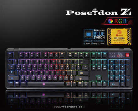 Tt eSPORTS 포세이돈Z RGB 키보드는 최신 32비트 마이크로 프로세서가 내장되어 있다. 이는 1680만 컬러 색상에 대해 완벽하게 구현이 가능한 5단계의 밝기 조절이 가능한 발광 다이오드를 각 키마다 내장하고 있어 색상에 대한 무한한 가능성을 발휘한다.