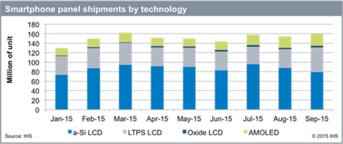 IHS Smartphone Display Shipment Tracker의 최신 정보에 따르면, a-Si TFT LCD 패널의 시장 점유율은 8월 대비 10% 떨어졌지만, 9월에 7960만개를 기록하며 여전히 스마트폰 디스플레이 공급량의 대부분을 차지하고 있다. 한편, AMOLED(active-matrix organic light-emitting diode) 패널 공급량은 7% 상승해 2천5백만 유닛을 기록했다.
