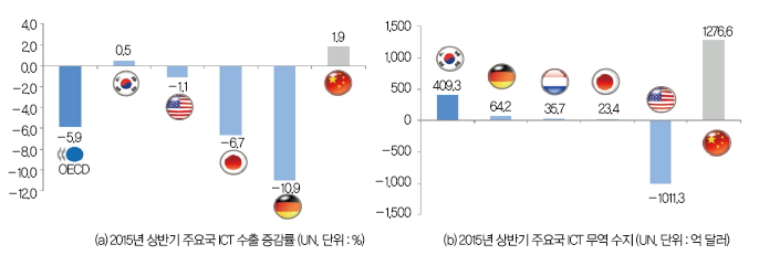 그림 1. 2015년 상반기 주요국 ICT 수출 증감률 및 무역 수지(자료 : 산업통상자원부)