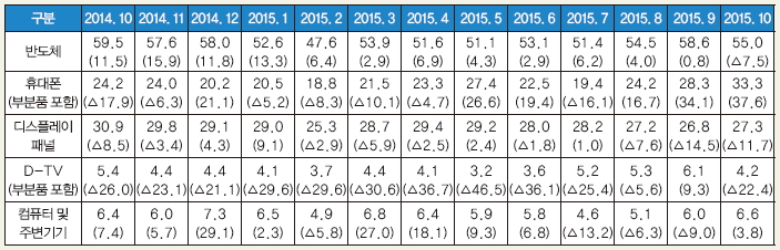 ICT 수출을 품목별로 살펴보면, 먼저 휴대폰의 경우, 갤럭시노트5, V10, 넥서스5X 등과 같은 국내 업체의 주력 스마트폰 출시 및 출하 확대, 부분품 수출 호조에 힘입어 지난 10월 수출액이 전년동기 대비 37.6% 증가한 33억 3천만 달러를 달성해 3개월 연속 두자릿수 증가세를 보였다. 컴퓨터 및 주변기기는 SSD(Solid State Disk) 등 보조기억장치(3억 5천만 달러, 전년동기 대비 23.5% 증가)의 수출 호조로 증가세를 회복해 전년동기 대비 3.8% 증가한 6억 6천만 달러를 나타냈다.