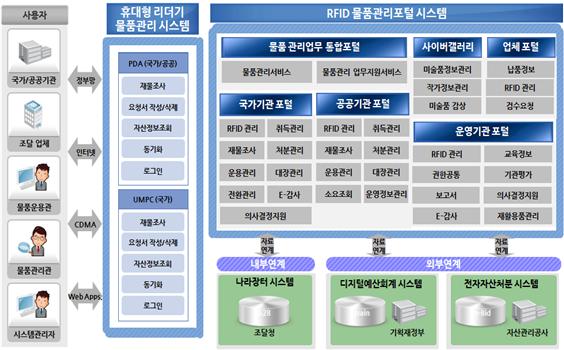 현재 RFID기반 물품관리 시스템을 운영하고 있는 국가기관은 국가기관 물품관리관서 3,182여개와 공공기관 31여개다. 투입된 RFID 장비는 휴대형 리더기 3,507대, 태그발행기 1,617대, RFID 태그 1,090만개로 매년 그 수가 지속적으로 증가하고 있다.