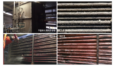 ‘에바콘’은 냉매인 암모니아 가스를 응축시키는 설비로서, 아연 도금관의 외벽에 물을 분사하고 증발시키기 때문에 관 표면에 스케일이 발생한다. 스케일은 암모니아 가스의 압력을 증대시켜 전력비를 상승시킨다.