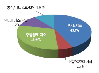 출원되는 주요 기술 분야는 센서 및 지도 기술(43.1%), 주행경로 제어 기술(29.6%), 인터페이스 및 단말 기술(11.2%), 통신·네트워크·보안 기술(10.6%), 조향·액추에이터 기술(5.5%) 등이다.