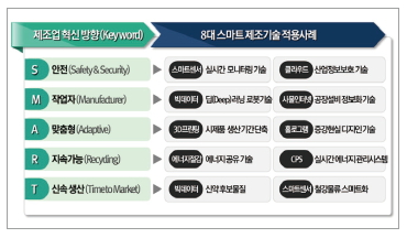 산업통상자원부와 미래창조과학부는 지난해 12월10일 ‘스마트제조 R&D 중장기 로드맵’을 확정해 발표했다. 8대 스마트 제조기술은 스마트센서, CPS, 3D프린팅, 에너지 절감 등 생산시스템 혁신기술 4개와 사물인터넷, 클라우드, 빅데이터, 홀로그램 등 정보통신 기반기술 4개이다.