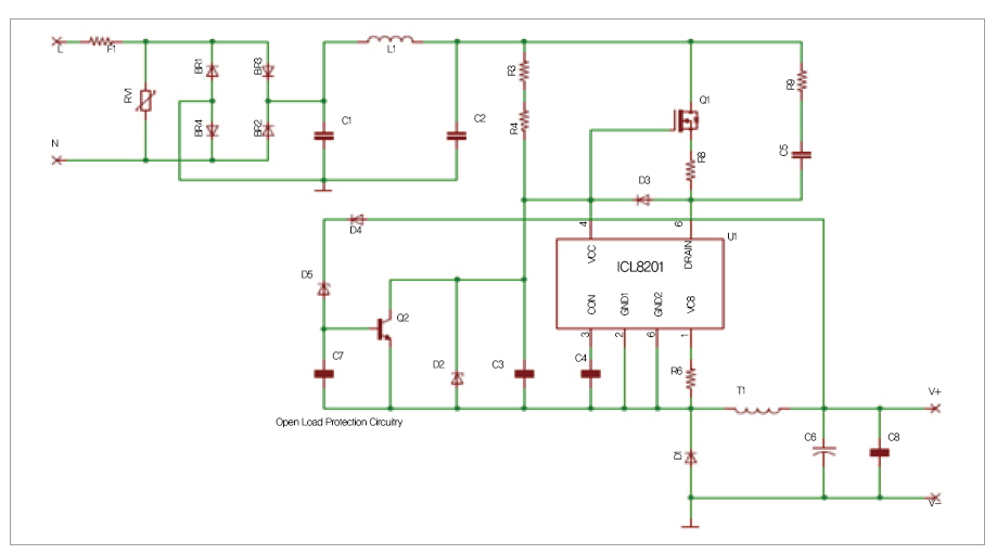 이 드라이버는 AC 라인 입력 전압을 검출하거나 출력 전압을 검출하지 않고 출력 전류 레귤레이션을 한다. 또한 SOT23-6 패키지로 다수의 기능들을 통합함으로써 폼 팩터를 소형화하고 디자인 비용을 낮출 수 있게 한다. 이 외에도 제로 전류 스위칭이 가능한 CrM(critical conduction mode) 모드 동작을 사용해 높은 효율과 낮은 EMI를 달성한다. 그림 2는 ICL8201을 기반으로 한 LED 드라이버 솔루션의 회로도이다.