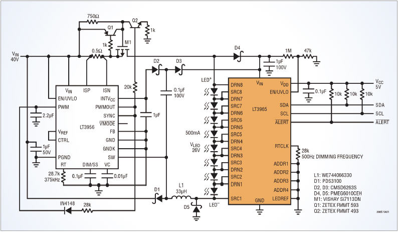 ▲ 그림 3. 직렬 LED 스트링을 구동하는 LT3956 회로도