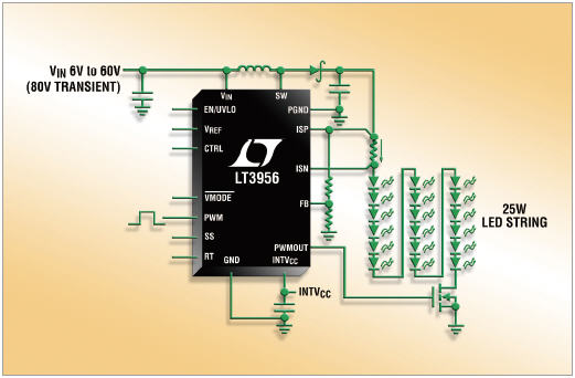 예를 들어 최근 출시된 신제품 LT3965는 80V 입력 및 출력 전압을 지원하는 정전류, 정전압 컨버터이다. 이 토폴로지는 고전류 LED를 구동할 수 있게 해 준다(그림 3).