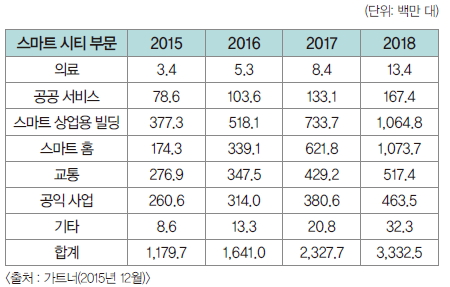 이에 시장조사기관인 가트너가 2016년 스마트 시티 내 사용되는 사물인터넷 기기 및 웨어러블, 모바일폰, 태블릿, PC 등 각종 디바이스 시장을 분석·전망한 내용을 정리했다.