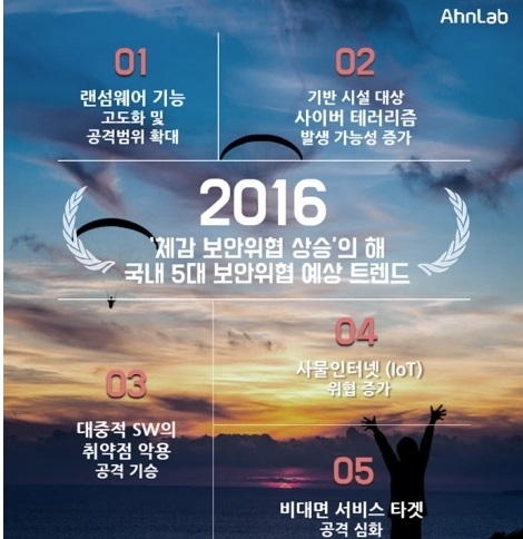 안랩(대표 권치중, www.ahnlab.com)은 2016년 5大 사이버 보안위협 예상 트렌드를 발표하고, 2016년이 사이버 보안위협이 개인의 일상 생활에 깊이 영향을 미치는 ‘체감 보안위협 상승 (real-life cyber threat)’의 해가 될 것으로 전망했다.