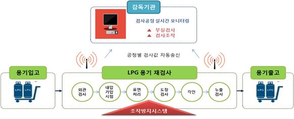 산업통상자원부가 사물인터넷(IoT) 기술을 활용해 모든 재검사과정이 자동으로 기록되고 관리돼 검사 항목의 누락여부를 감시할 수 있는 LPG용기 검사공정 실시간 모니터링 시스템을 2017년 1월부터 도입하기로 했다.