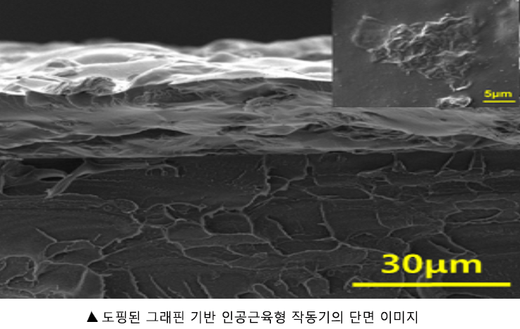 KAIST 오일권 교수 연구팀이 화학적 도핑된 그래핀을 이용해 고성능의 인공근육형 작동장치를 개발했다. 이번 개발된 인공근육 작동장치는 기존 기술보다 3배 이상의 굽힘 변형을 보이고 5시간 이상 구동해도 성능을 유지할 수 있다.