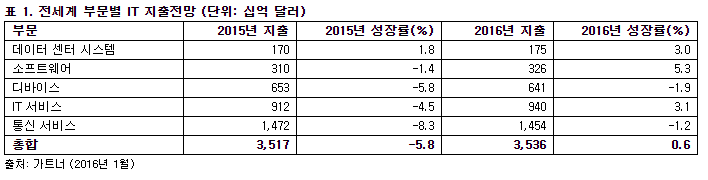 2016년 전세계 IT 지출이 2015년 대비 0.6% 증가한 3조5400억 달러에 이를 것으로 시장조사기관인 가트너가 보고했다. 미달러화 기준 2015년 IT 지출 규모는 가트너가 IT 지출 규모를 측정한 이래로 가장 큰 하락폭을 기록했다. 2014년과 비교해 2015년 지출은 2,160억 달러 감소했다. 2019년이 되어야 2014년의 지출 수준으로 회복될 것으로 전망했다.