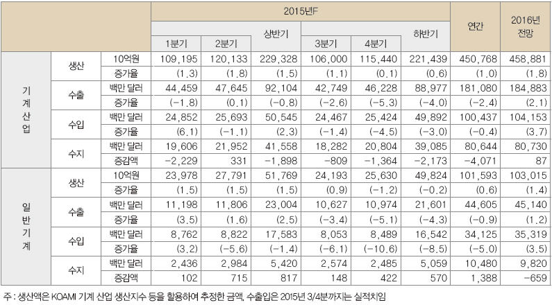 기계산업진흥회가 전망한 2016 기계 산업 수출입 동향을 살펴보면, 5대 기계 산업(선박 제외) 생산은 458조 9천억원(1.8% 증가), 수출은 1848억 8천만 달러(2.1% 증가), 수입은 1041억 5천만 달러(3.7% 증가), 무역수지 흑자는 807억 3천만 달러에 이를 것으로 예측되고 있다. 또한 5대 기계 산업 중 일반기계 생산은 103조원(1.4% 증가), 수출은 451억 4천만 달러(1.2% 증가), 수입은 353억 2천만 달러(3.5% 증가), 무역수지 흑자는 98억 2천만 달러로 지난해와 비슷한 상태를 유지할 것으로 전망되고 있다.