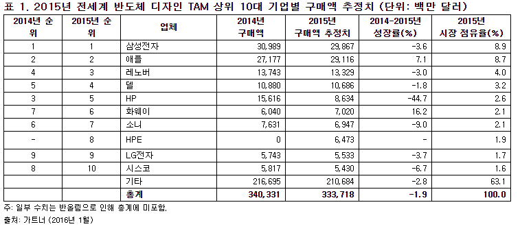 가트너의 수석 연구원인 마사츠네 야마지(Masatsune Yamaji)는 "삼성전자와 애플은 5년 연속으로 반도체 구매 지표에서 선두 자리를 유지했지만 2014년과 2015년에 삼성전자의 디자인 TAM(Total Available Market) 성장률은 전체 반도체 시장 성장률보다 낮은 것으로 나타났다. 최근 5년 간 가장 빠르게 성장하는 기업으로 평가 받은 삼성전자와 레노버의 2015년 반도체 구매액이 하락했고 반도체 칩 제조사가 주요 고객을 통해 얻는 수익이 감소할 위험이 높아지고 있다"고 밝혔다.