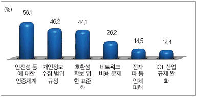 우선, 사물인터넷(IoT) 활성화를 위해서는 저렴한 가격(44.5%)과 설치·이용 용이(42.5%) 등을 우선 고려하는 것이 필요하며, 이를 위한 선결과제는 안전성 등에 대한 인증체계(56.1%), 개인정보 수집 범위 규정(46.2%), 호환성 확보를 위한 표준화(44.1%) 등인 것으로 조사됐다.