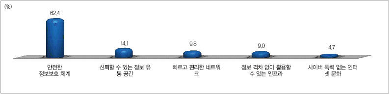 한편, 미래 인터넷 사회에 대해서는 대부분의 인터넷 이용자들은 미래 인터넷 사회를 세상 모든 것이 상호작용하는 초연결사회로 인식(80.6%)하고 있으며, 미래 인터넷 사회에 대비하기 위해 안전한 정보보호 체계(62.4%), 신뢰할 수 있는 정보유통 공간(14.1%) 등이 필요하다고 인식하는 것으로 나타났다.