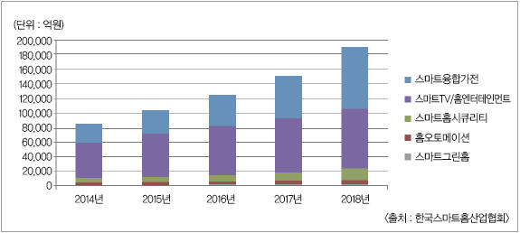 국내 스마트홈 시장에서 가장 많은 비중을 차지하고 있는 것은 스마트TV 등의 영상 가전이나, 냉장고나 세탁기와 같은 스마트 융합가전이 향후 스마트홈 시장의 성장을 이끌 것으로 주목받고 있다(그림 1).
