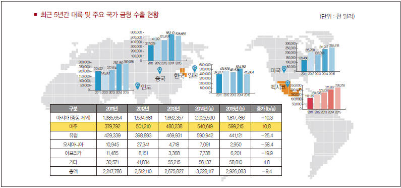 그러나 지난해 중국 경제 부진과 장기화된 엔저 현상 등으로 금형산업뿐만 아니라 전 산업 경기가 침체됐다. 특히 금형산업은 수출 29억2,592만 달러로 전년대비 9.4%가 하락하는 등 2009년 세계 금융위기 이후 전년대비 첫 감소를 기록했다. 지난해에는 최대 수출 지역인 일본으로의 수출이 엔저 현상 등으로 전년대비 1억1,914만 달러가 감소함에 따라 전체 수출 하락에 막대한 영향을 끼친 것으로 보인다. 또한 우리나라 최대 수출 지역으로 떠오른 중국도 지난해에는 5억3,665만 달러의 실적으로 전년대비 4.7% 하락했으며, 유럽도 유로화 약세로 25.3% 감소한 것으로 조사되어 우리나라 전체 금형 수출 하락으로 이어졌다.