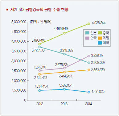 우리나라는 2014년 금형 수출 32억2,811만 달러, 수입 1억5,881만 달러로 무역수지 흑자도 30억6,930만 달러를 기록하며 무역수지 흑자 기록을 갱신했다. 더구나 우리나라와 세계 시장에서 경쟁하고 있는 세계 5대 금형강국인 일본, 중국, 독일, 미국의 금형 수출 현황 조사 결과, 우리나라 금형 수출은 사상 처음 세계 2위 자리로 올라서기도 했다.