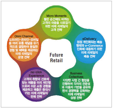 ▲Omni-Channel ▲Micro Moments ▲eDelivery ▲Business Collectives ▲no-Click Experience가 그것이다. Omni-Channel은 이미 유통업계가 34년 전부터 주목하고 있는 개념으로, 여러 쇼핑 채널을 유기적으로 결합하여 고객에게 동일한 경험 및 혜택을 제공하는 미래 리테일의 운영 전략이다.