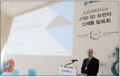 ▲ 다니엘 톰슨 스트라타시스 코리아 지사장이 동대문디자인플라자에서 열린 신제품 발표회에서 J750의 최첨단 기술과 솔루션에 대해 소개하고 있다.