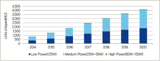 2015년 LED 조명 출하량은 전체 조명 시장의 약 8%를 차지했지만, 2020년에는 27%로 늘어날 것으로 전망되고있다. 따라서 LED 조명에 사용되는 전력 부품과 전력 드라이버의 출하량도 2015년 14억 개에서 2020년에는 45억 개로 성장할 것으로 IHS는 내다봤다.
